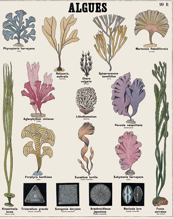 Les Algues Mieux qu’une photographie, le dessin permet de présenter une vue synthétique de l’objet tout en conservant la précision des détails. On notera la beauté des couleurs pastel utilisées ici.
