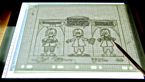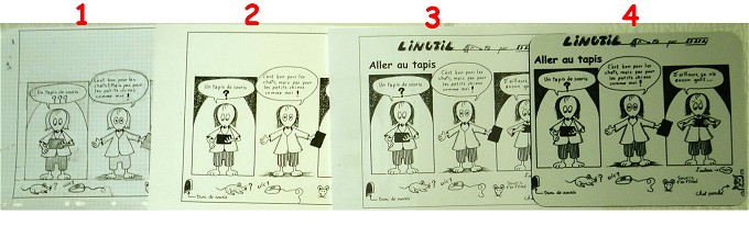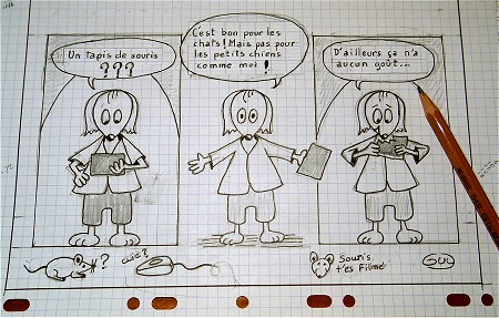 Tout commence par un script, comme au cinéma, décrivant l’action et précisant les dialogues. Pour les épisodes « ordinaires », le récit se déroule habituellement sur 4 cases. Ici, il faut prendre en compte le format particulier du tapis de souris, rectangulaire et plus large que haut. On décide donc de limiter l’épisode à 3 cases, se succédant horizontalement.